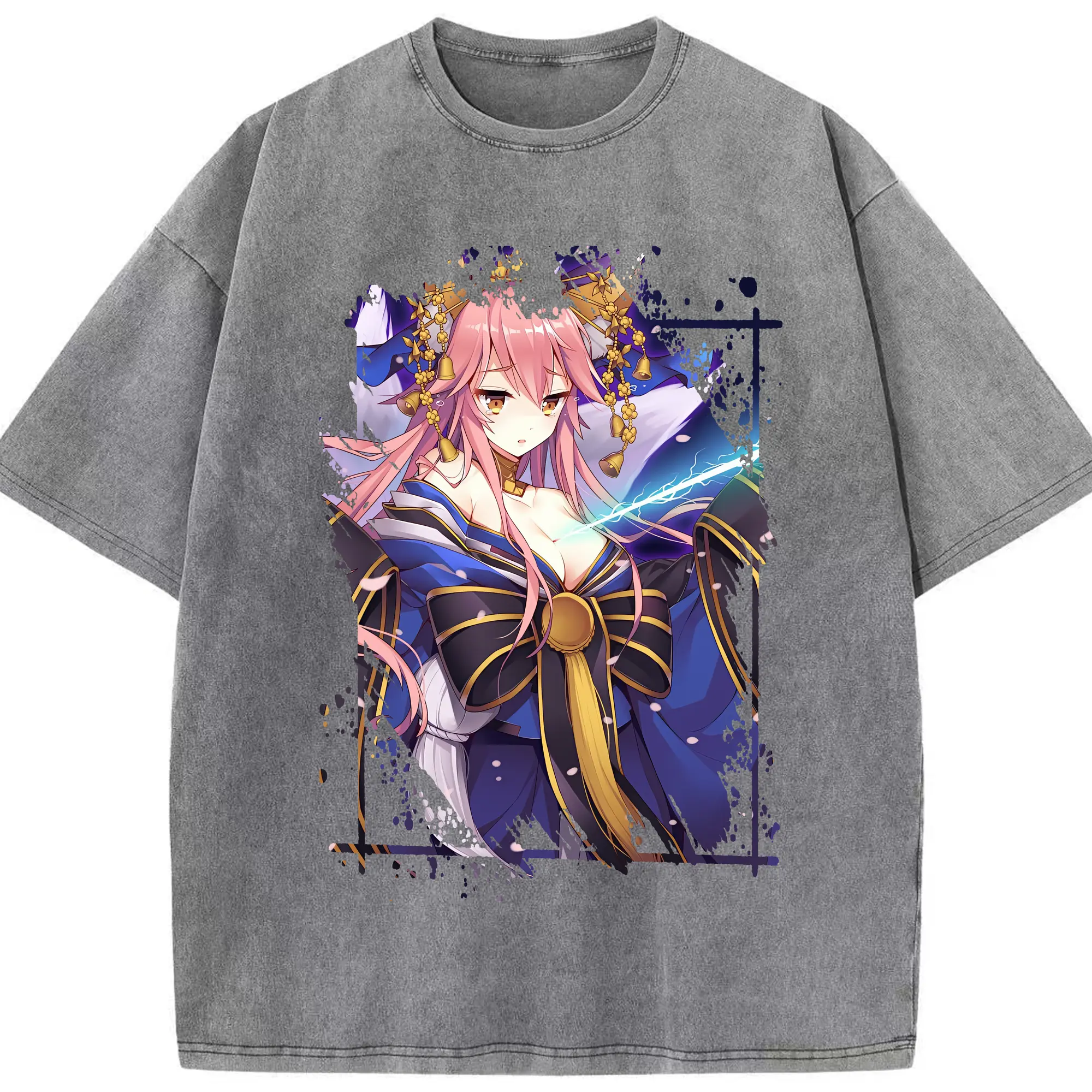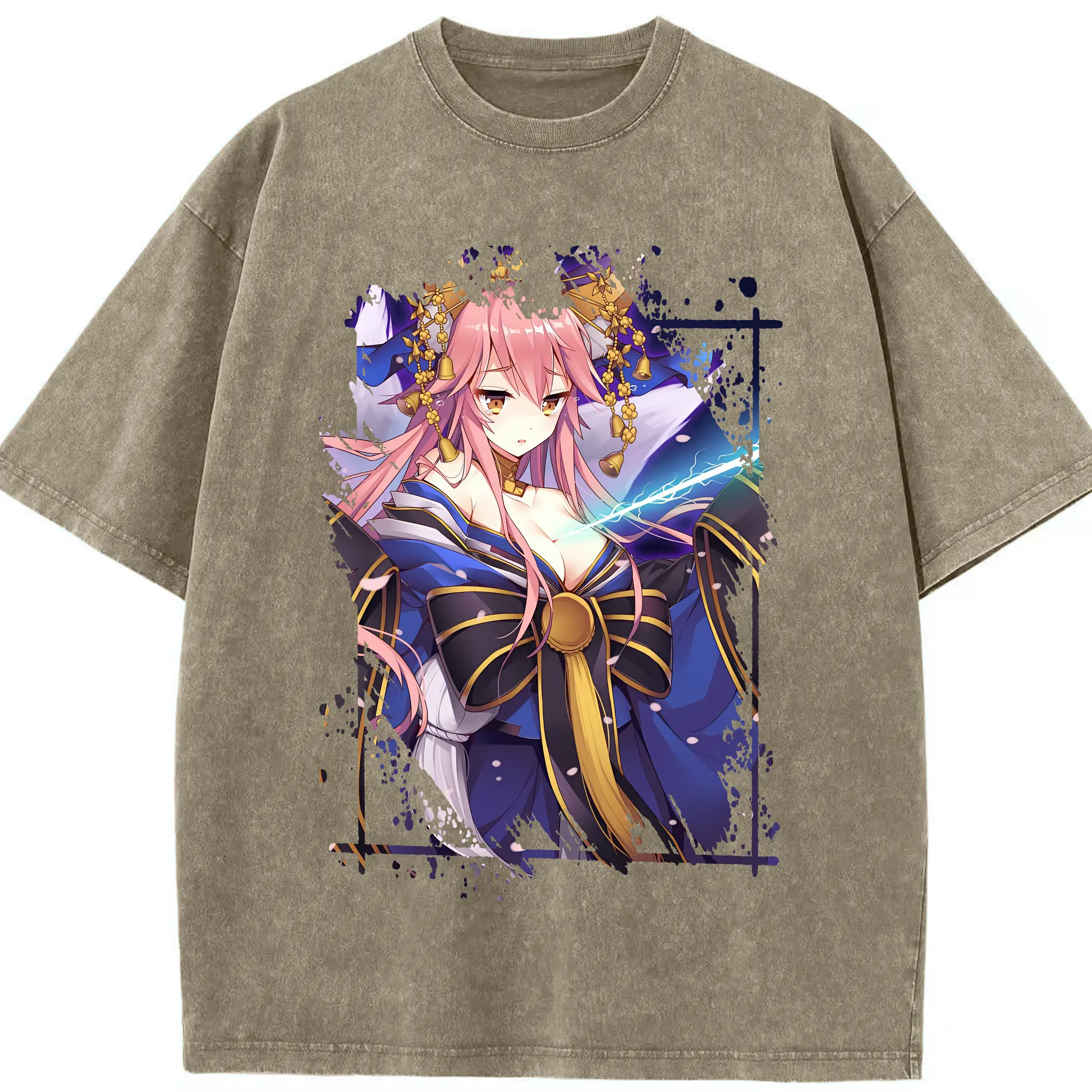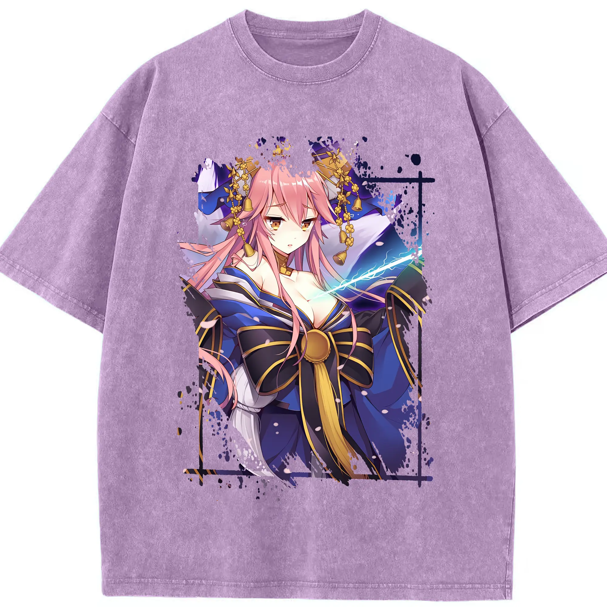 FGO グッズ,玉藻の前 - 綿100% ヴィンテージ風 半袖Tシャツ ・ 背面プリント ・ 柔らか肌触り ・ 通気性 快適 ・ スポーツ カジュアル 外出用